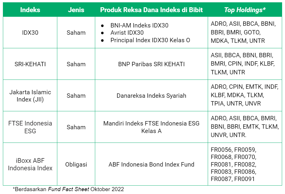 Jadi saat memilih untuk investasi di Reksa Dana Indeks, sebaiknya kita juga sudah harus tau indeks apa yang digunakan sebagai acuannya! Nah, ada berbagai indeks dalam pasar modal. Beberapa indeks yang digunakan sebagai acuan bagi produk Reksa Dana Indeks di Bibit adalah sebagai berikut: