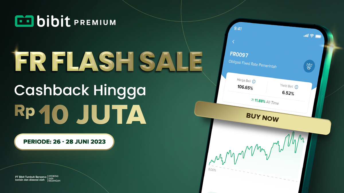 Khusus Nasabah Bibit Premium ada cashback reksa dana Rp100.000 untuk setiap pembelian Obligasi FR kelipatan Rp50.000.000 dengan maksimal cashback hingga Rp10 juta. Promo berlaku kelipatan dan kumulatif selama periode promo hingga 28 Juni 2023 pukul 14.00.