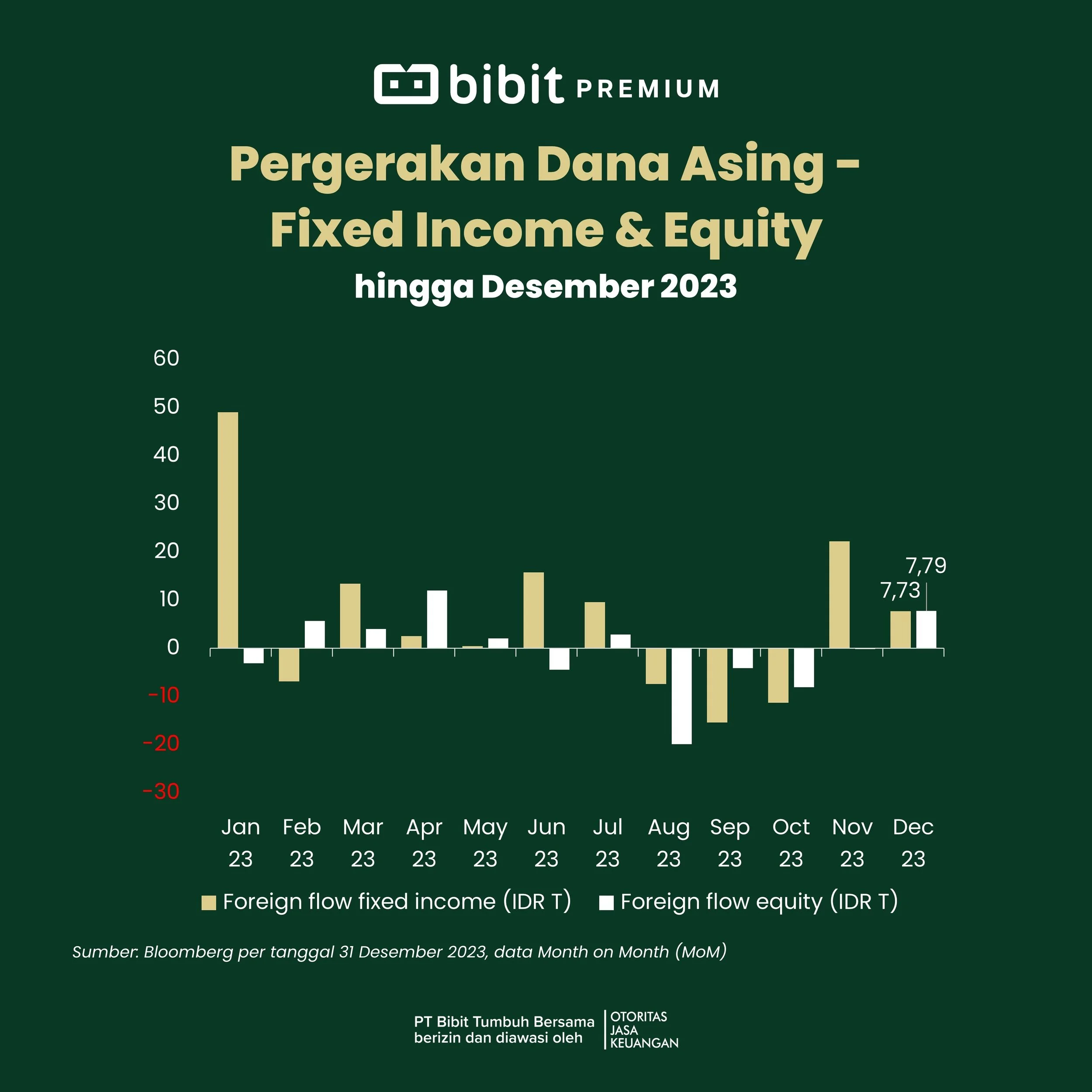 Selama Desember 2023, Indeks Harga Saham Gabungan (IHSG) naik +2,71% MoM, dengan aliran dana dari investor asing tercatat inflow sebesar Rp7,79 triliun.