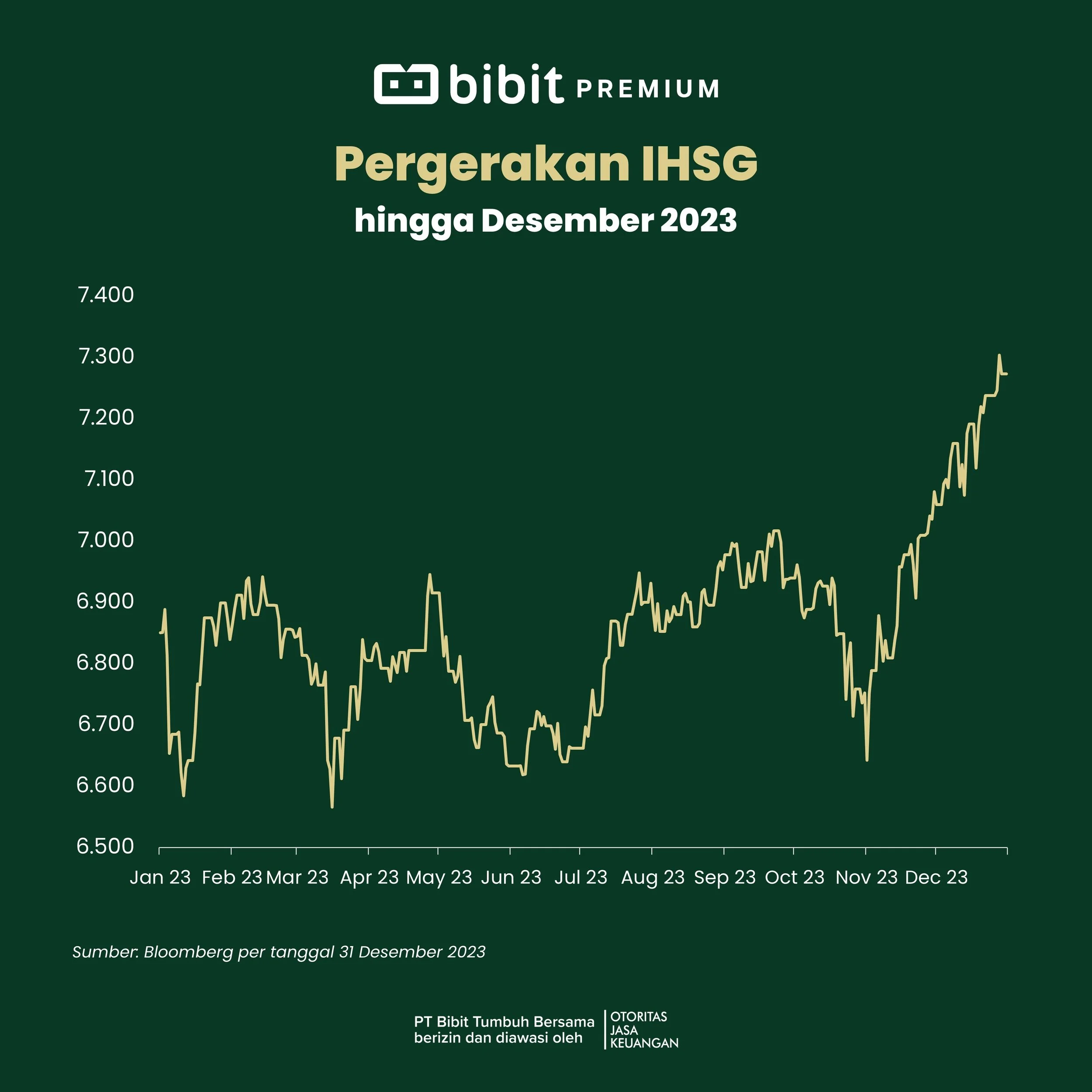 IHSG ditutup di level 7.080, naik +2,71% MoM pada Desember 2023.