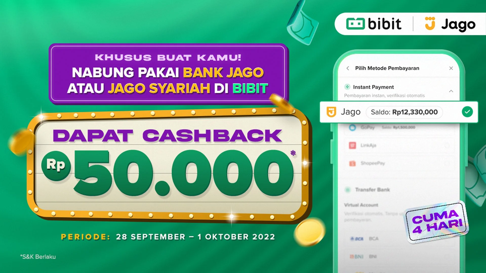 Nabung reksa dana di Bibit apa saja pakai Jago pasti cashback Rp50 ribu! Kamu bisa mendapatkan kemudahan pencairan instan dengan nabung di Bibit pakai Bank Jago/Jago Syariah