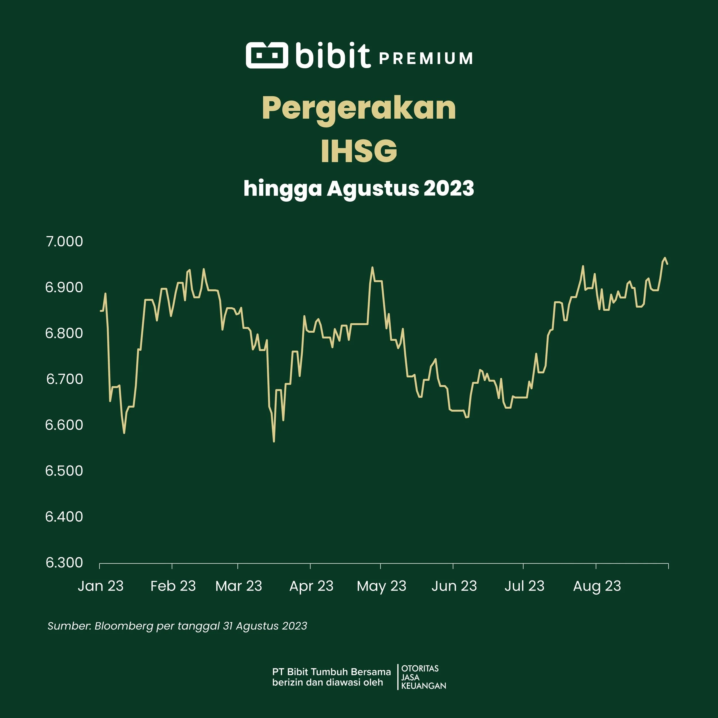 IHSG ditutup di level 6.953, naik +0,32% MoM pada Agustus 2023.