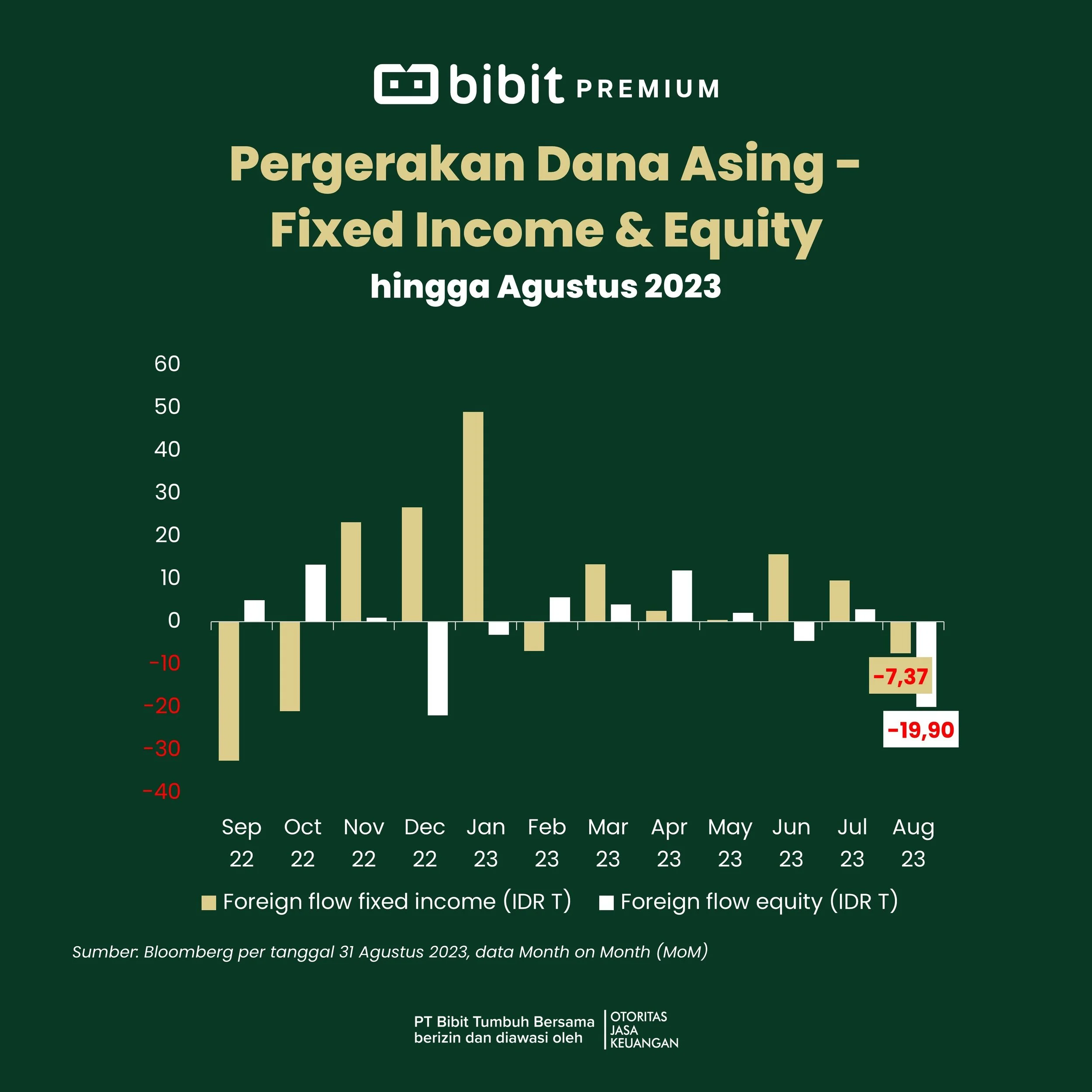 Aset fixed income atau obligasi: terjadi outflow dari aliran dana asing pada Agustus 2023 sebesar Rp7,37 triliun, berbalik dari inflow pada Juli 2023 sebesar Rp9,64 triliun.