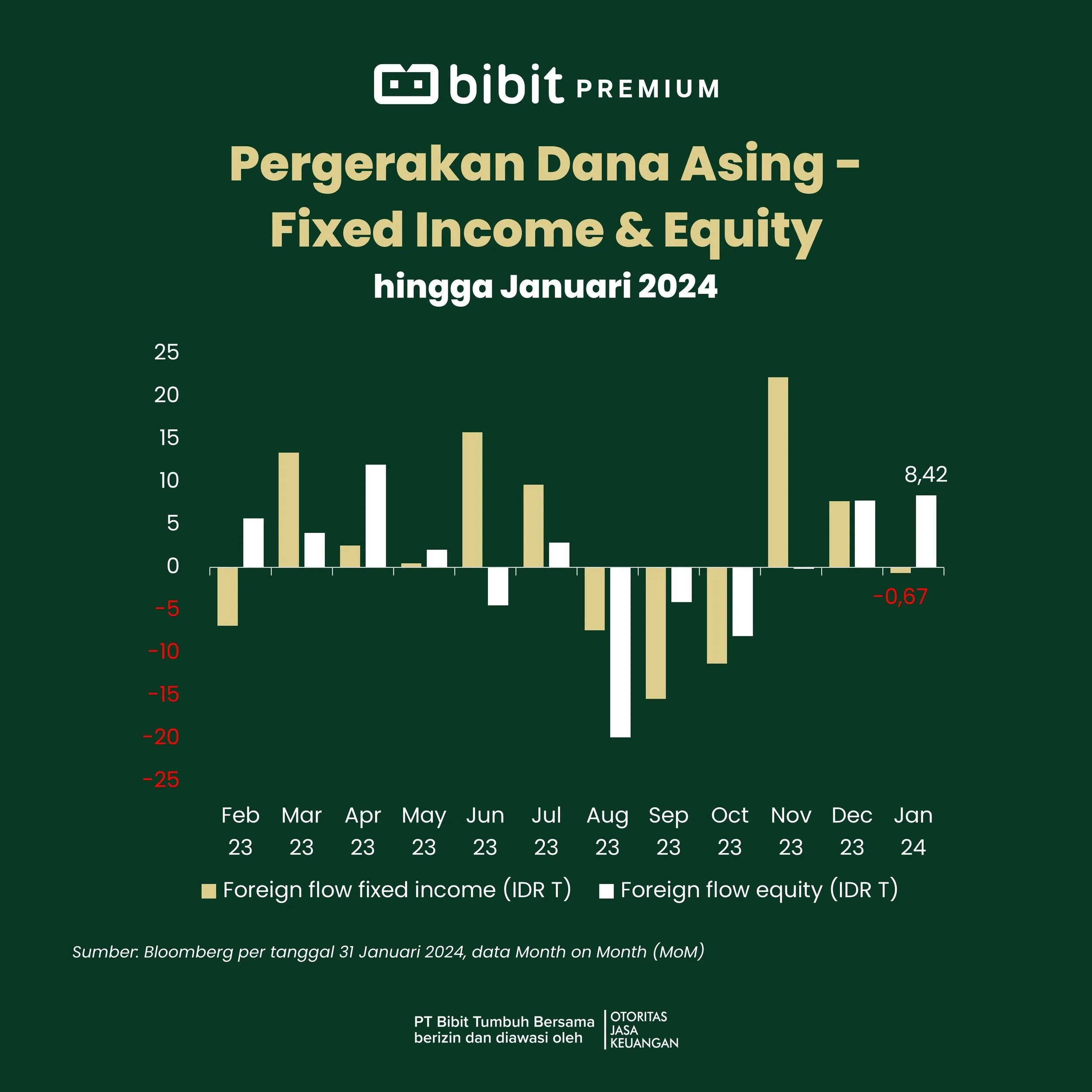 Selama Januari 2024, Indeks Harga Saham Gabungan (IHSG) turun -0,89% MoM, dengan aliran dana dari investor asing tercatat inflow sebesar Rp8,42 triliun.