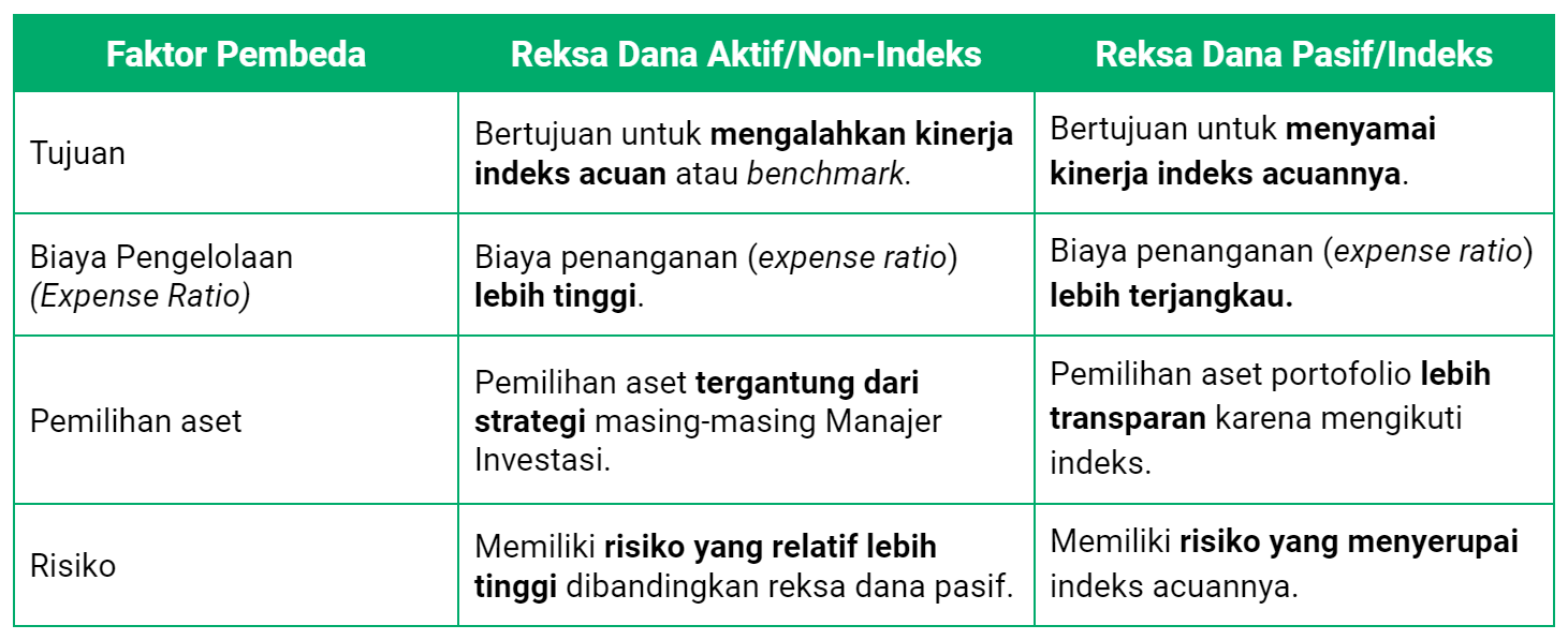 Setelah memahami pengertian reksa dana aktif dan pasif (indeks), kita bisa memahami perbedaan dari kedua jenis reksa dana tersebut. Yuk simak tabel berikut supaya kamu jadi lebih mengerti!