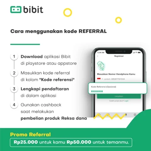 Yuk share sebanyak-banyaknya kode Referral kamu dan dapatkan Cashbacknya lebih banyak. Dapatkan kode referral hanya di aplikasi bibit, segera unduh sekarang juga!