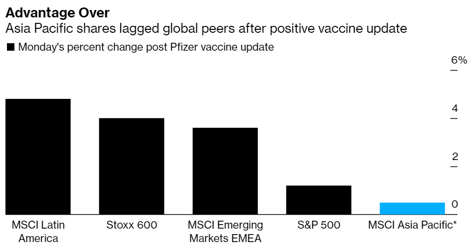 Terlihat pada gambar di bawah, kenaikan harga index saham pada hari Selasa, 10 November yang lalu. Setelah ada pengumuman keberhasilan vaksin Pfizer, index MSCI Asia Pacific menunjukan kenaikan yang paling rendah diantara yang lain. Dikutip dari Bloomberg, berita berhasilnya vaksin sudah tidak berpengaruh besar terhadap pasar saham di Asia, akibat berhasilnya penanganan kasus infeksi.