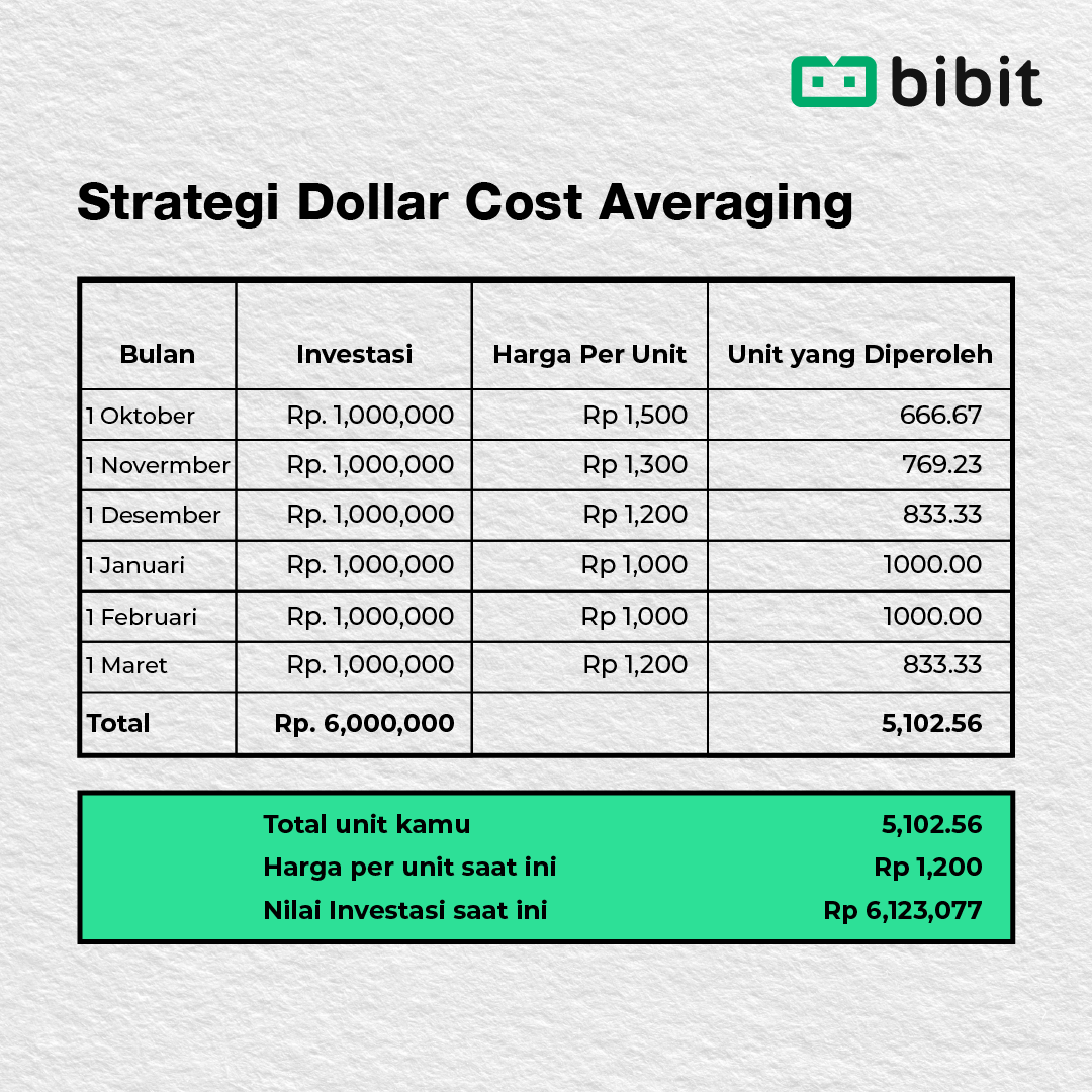 Nabung rutin bisa kamu mulai dengan uang Rp 100 ribu sekalipun. Tanpa peduli kondisi ekonomi. Strategi ini akan membantu kamu disiplin untuk membeli unit yang lebih banyak pada waktu harga turun dan lebih dikit pada waktu harga naik. Ini akan membuat kamu mengambil keputusan investasi yang lebih mudah dan terhindar dari keputusan emosional.