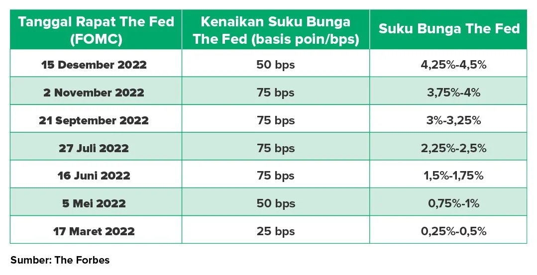 The Fed kembali menaikkan suku bunga acuan 50 basis poin (bps) atau 0,5% dari 3,75%-4% menjadi 4,25%-4,5% pada Desember 2022.