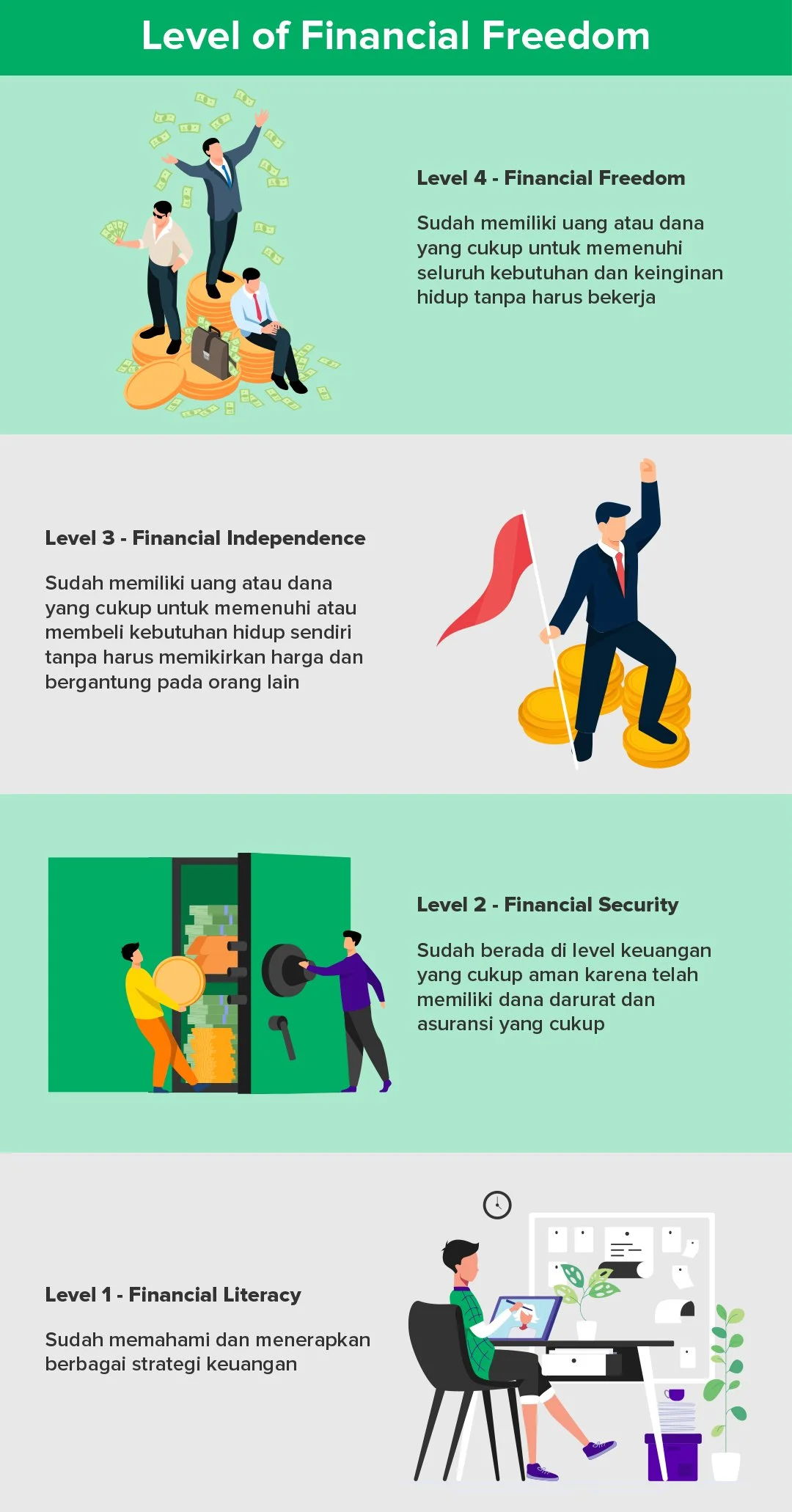 Sebelumnya kita sudah mengetahui manfaat financial freedom dan tips untuk mencapai financial freedom. Sekarang kita akan mempelajari bahwa ada 3 level untuk menuju Financial Freedom dan bagaimana cara menghitung dana yang dibutuhkan untuk financial freedom yang harus kamu ketahui. Yuk simak selengkapnya pada gambar dibawah ini!