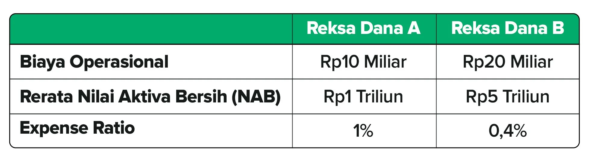 Dilihat sekilas, Reksa Dana A punya biaya operasional lebih rendah. Namun, karena Reksa Dana B memiliki rerata NAB yang lebih besar, maka expense ratio-nya jadi lebih rendah.