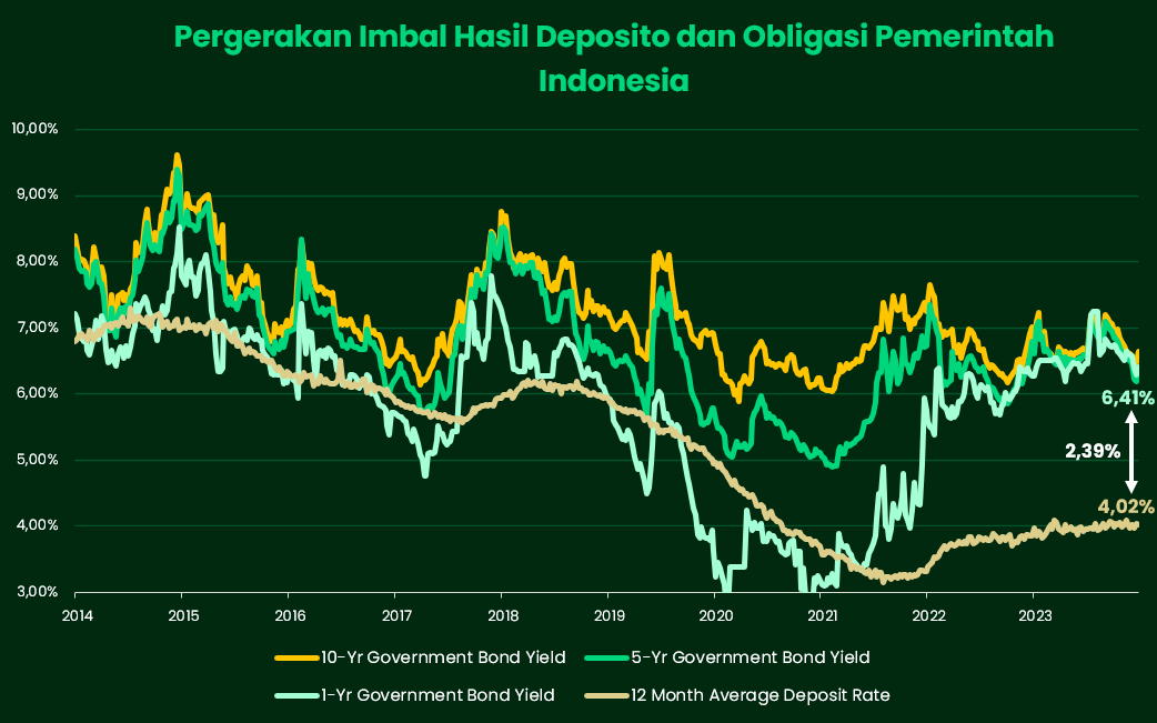 Ini karena melebarnya perbedaan imbal hasil antara obligasi dan rata-rata deposito. Selain itu, pajak obligasi 50% lebih rendah dibandingkan deposito (pajak obligasi 10% vs pajak deposito 20%).