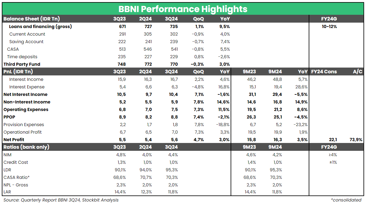 Kami menilai kinerja Bank Negara Indonesia ($BBNI) pada 3Q24 sebagai performa yang cukup positif, dengan laba bersih tumbuh menjadi Rp5,6 T (+5% QoQ, +3% YoY). Hasil ini membuat laba bersih selama 9M24 tumbuh menjadi Rp16,3 T (+3,5% YoY), sedikit di bawah ekspektasi karena setara 74% dari estimasi FY24F konsensus.