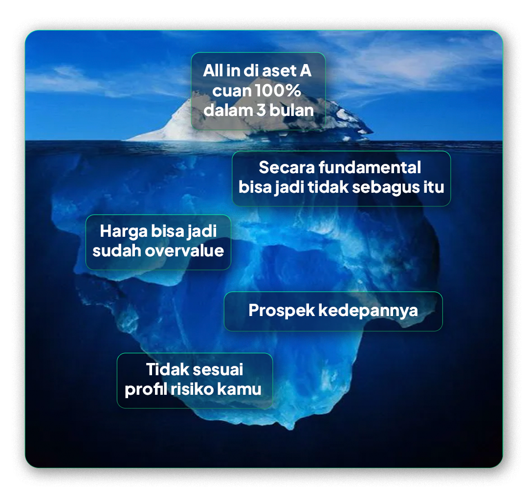 Sering kali investor hanya melihat potensi keuntungan jangka pendek di permukaan, padahal ada faktor lain seperti aspek fundamental, valuasi, hingga kesesuaian dengan profil risiko yang sering kali terabaikan.