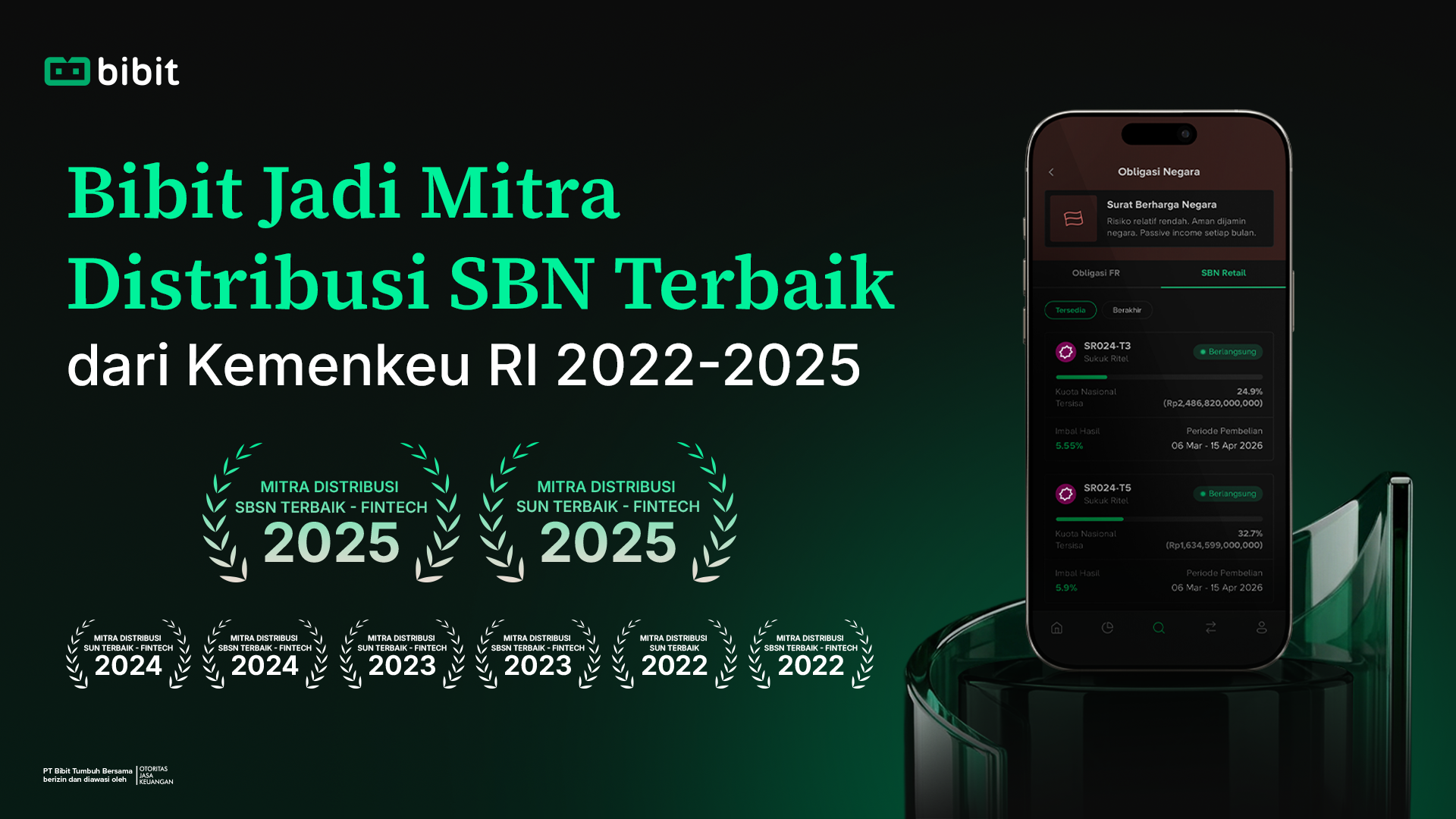 Penghargaan ini menjadikan Bibit sebagai satu-satunya fintech yang meraih penghargaan sebagai Mitra Distribusi SBN dan SBSN terbaik di 2025. Pencapaian ini melanjutkan rekam jejak Bibit yang telah konsisten meraih penghargaan serupa selama 4 tahun berturut-turut, pada 2022, 2023, 2024 dan 2025.