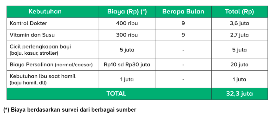 Biaya ini meliputi periksa ke dokter kandungan hingga biaya melahirkan yang nominalnya tentu bervariasi. Setelah seorang anak lahir, tentunya kebutuhan pasti akan bertambah. Mulai dari kebutuhan untuk Ibu hingga kebutuhan bagi si kecil.