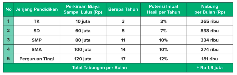 Berdasarkan rincian biaya di atas, kamu bisa mulai menabung untuk dana pendidikan tersebut berdasarkan dengan timeline atau jangka waktu. Namun, jika berdasarkan hitungan budget bulanan kamu merasa belum mampu, maka tentukan skala prioritas. Misal, yang paling mendekati adalah untuk jenjang TK dan SD, maka kamu bisa fokus dulu ke tujuan tersebut.
