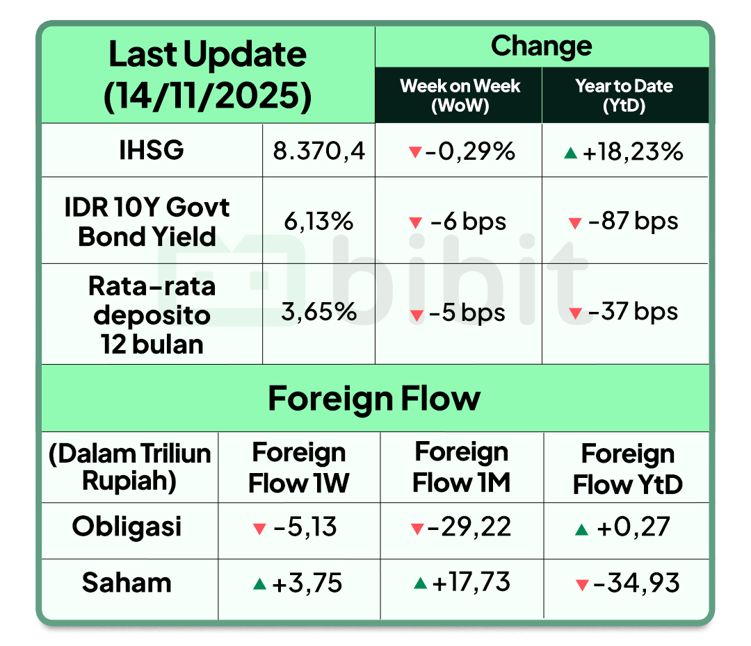 Sumber: Bloomberg per 14 November 2025, kecuali data foreign flow obligasi per 11 November 2025