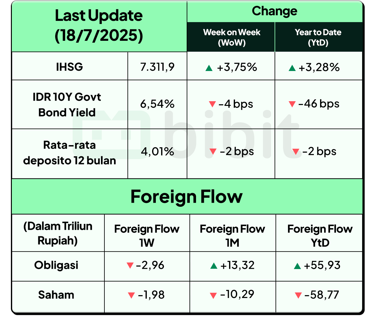 Sumber: Bloomberg per 18 Juli 2025, kecuali Foreign Flow Obligasi per 16 Juli 2025