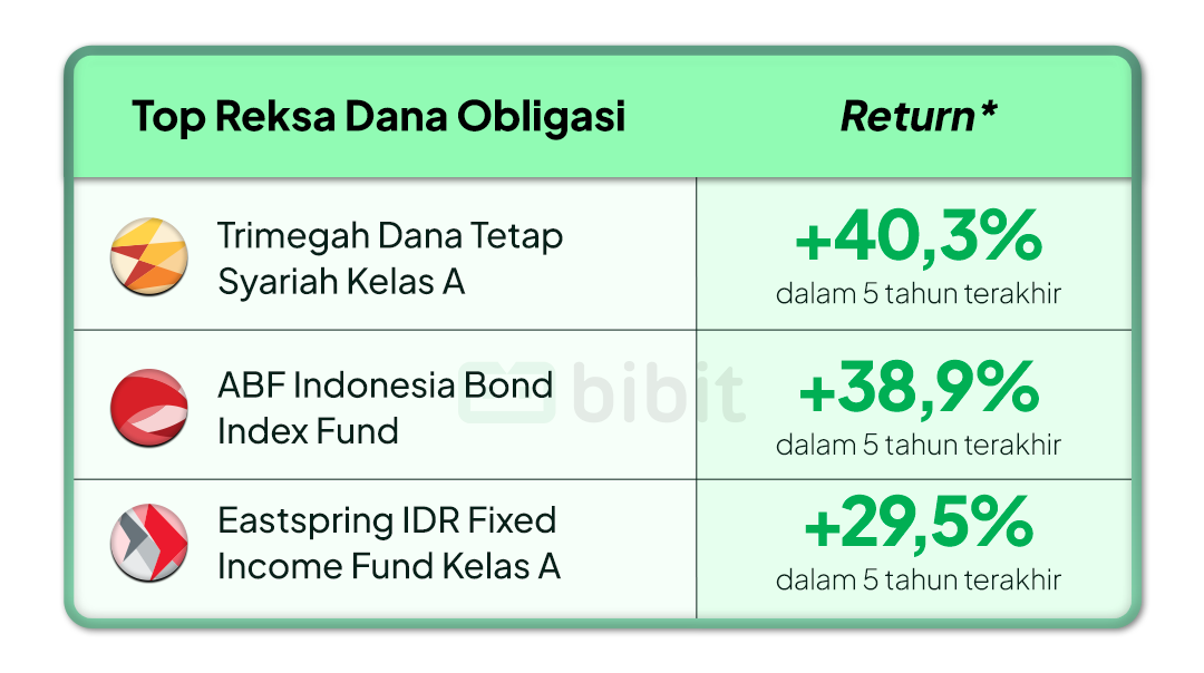 📈 Reksa Dana Obligasi Konsisten Naik Jangka Panjang 38% dalam 5 Tahun Terakhir – Jika memiliki financial goals 5-10 tahun, Reksa Dana Obligasi yang berisikan obligasi negara bisa dipertimbangkan untuk jadi pilihan aset dan mengoptimalkan danamu. Secara historis, Reksa Dana Obligasi yang berisi obligasi negara mencatatkan performa yang konsisten naik dalam jangka panjang.