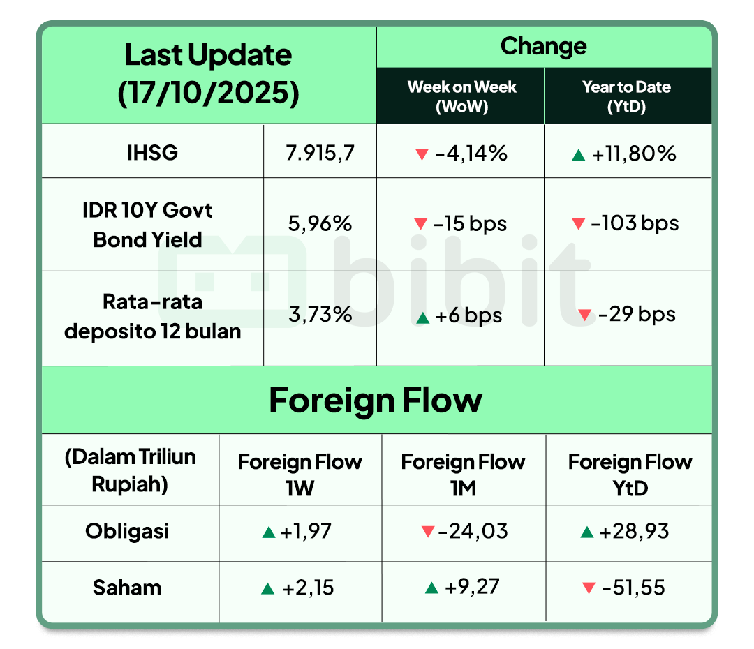 IHSG anjlok -2,57% pada Jumat (17/10) ke level 7.916, ditekan oleh penurunan DSSA (-13,8%), BREN (-5,10%), BRPT (-7,12%), CUAN (-9,66%) dan MLPT (-15%). Penurunan ini membuat IHSG turun -4,14% WoW.
