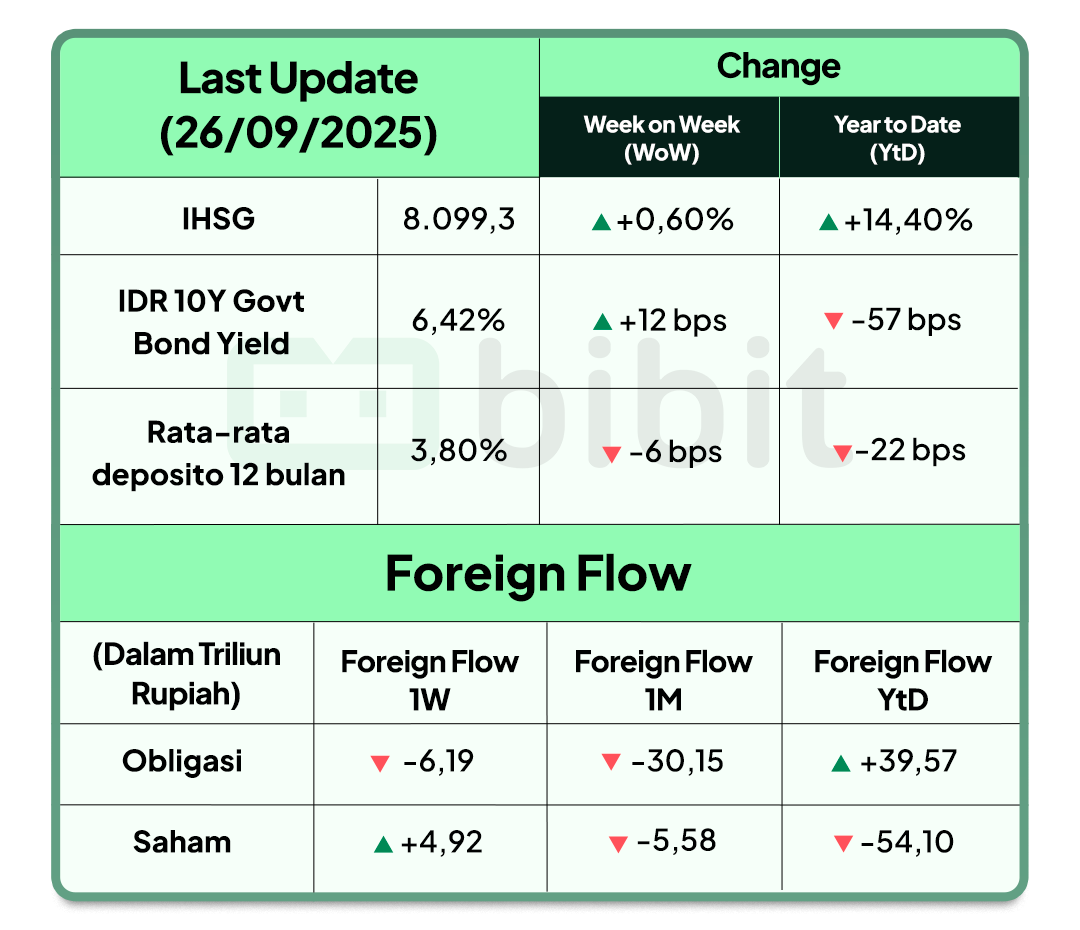 Sumber: Bloomberg per 26 September 2025, kecuali Foreign Flow Obligasi per 24 September 2025