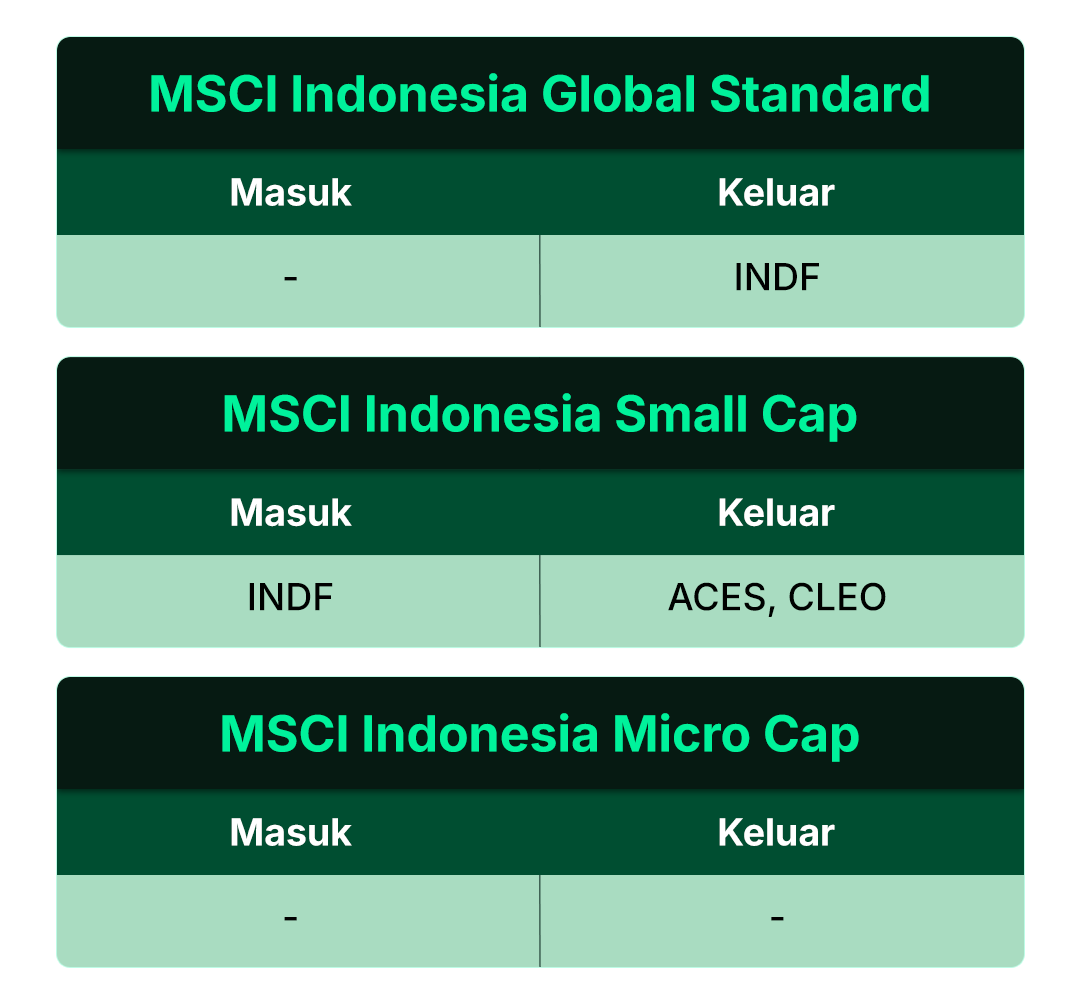 MSCI mengumumkan evaluasi indeks saham Global Standard, Small Cap, dan Micro Cap, dengan tanggal efektif pada 28 Februari 2026. Evaluasi kali ini hanya mencakup penghapusan (deletions) konstituen dari indeks dan perpindahan turun antar–indeks segmen ukuran. Berikut rinciannya: