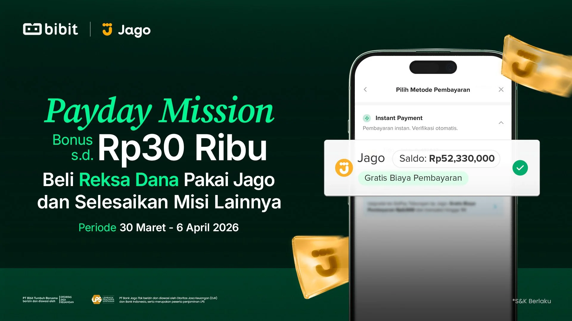 Ada payday promo khusus bagi pengguna Bibit dan Jago. Lakukan misi berikut dan raih bonus hingga Rp30 ribu. Berikut syarat dan ketentuannya.