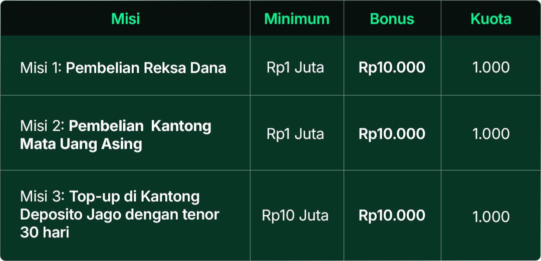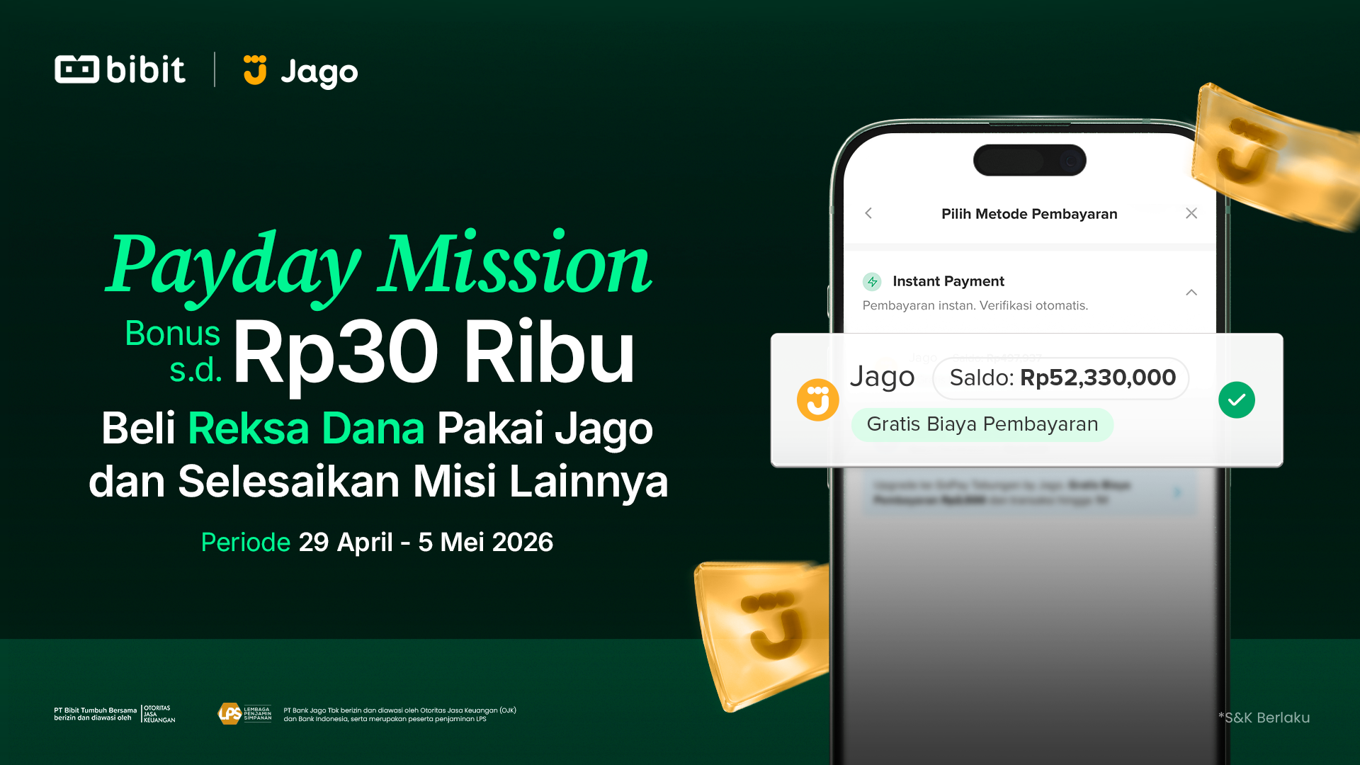 Payday promo kembali hadir khusus bagi pengguna Bibit dan Jago. Lakukan misi berikut dan raih bonus hingga Rp30 ribu. Berikut syarat dan ketentuannya.