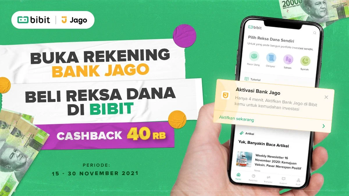 Lakukan pembelian reksa dana apa saja minimal Rp50.000 di aplikasi Bibit untuk mendapatkan cashback sebesar Rp 40.000 dengan menggunakan metode pembayaran Bank Jago selama periode promo