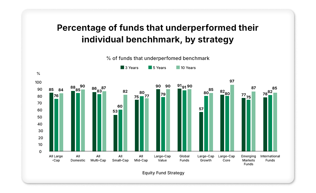 Data menunjukkan 80–90% fund manager aktif di Amerika Serikat gagal mengalahkan indeks acuannya dalam 10 tahun terakhir.