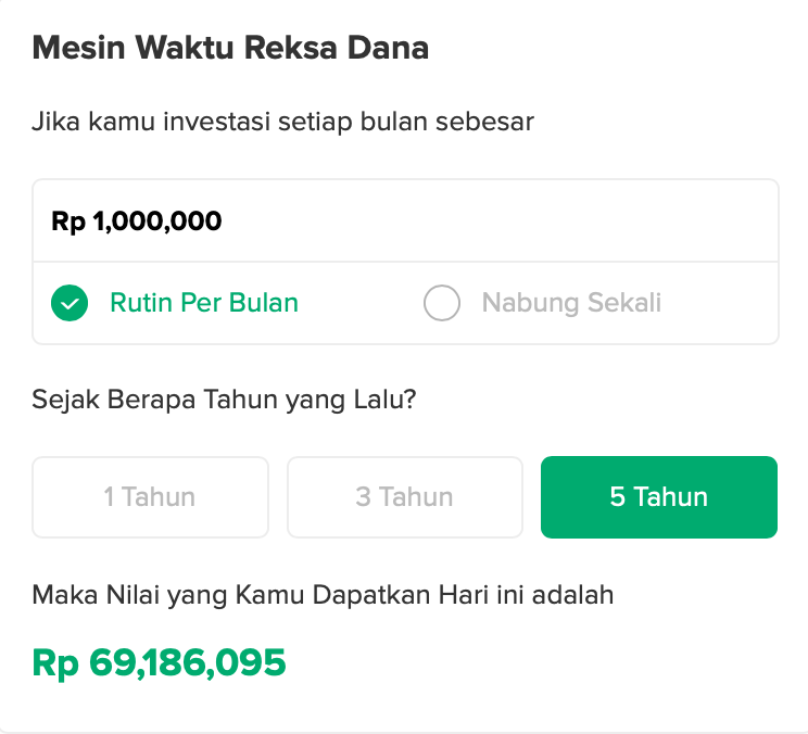 Investasi bisa menjadi salah satu cara untuk melawan inflasi. Karena dengan berinvestasi, kamu berpotensi mendapatkan imbal hasil sehingga bisa membuat uangmu menjadi berkembang. Salah satu contohnya adalah berinvestasi di instrumen reksa dana. Mari kita lihat jika kamu menabung di salah satu produk reksa dana pasar uang (RDPU) sebesar Rp1 juta setiap bulannya di Bibit selama 5 tahun.