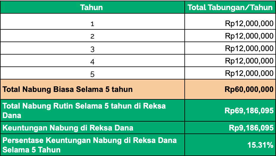 Gambar di atas merupakan perbandingan ketika kamu menabung biasa di rekening bank dengan menabung rutin reksa dana selama 5 tahun. Ketika kamu hanya menabung biasa, total tabunganmu selama 5 tahun sebesar Rp60 juta. Tetapi ketika kamu menabung di reksa dana, total tabunganmu akan menjadi Rp69.186.095, atau Rp 60 juta dari tabungan awalmu ditambah dengan jumlah imbal hasil sebesar 15.31% atau sebesar Rp9.186.095.