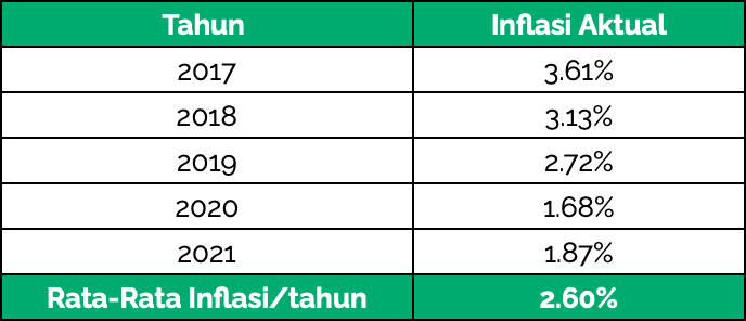Setelah melihat gambar di atas, kamu akan lebih sadar bahwa harga barang dan jasa terus naik setiap tahunnya. Mari kita lihat data inflasi aktual sepanjang 5 tahun terakhir pada gambar berikut ini