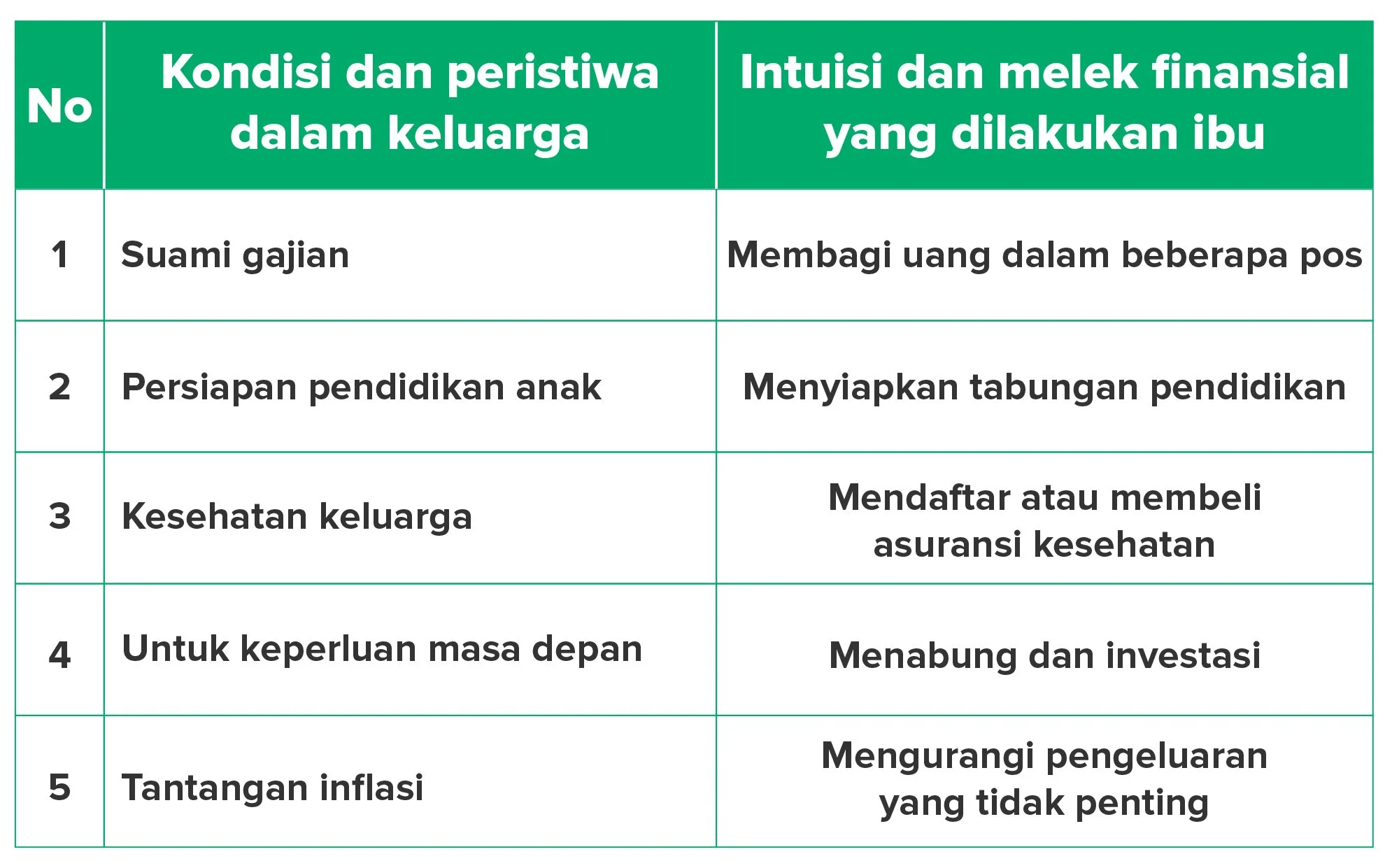 Berikut beberapa contoh peran ibu rumah tangga dalam keluarga terkait kesadaran dan melek finansialnya.