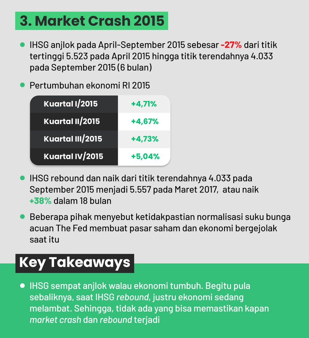 Resesi kadang bikin orang khawatir untuk investasi saham karena takut rugi. Orang-orang berbondong-bondong untuk memperkirakan crash IHSG karena potensi resesi di 2023. Namun, market crash bukan sesuatu yang perlu ditakuti berlebihan. Pasalnya, IHSG dan pasar saham global selalu bangkit (rebound) ketika situasi ekonomi mulai membaik, bahkan sebelum data membaiknya ekonomi tersebut keluar.
