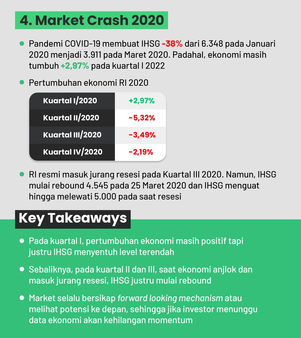Secara historis, IHSG terbukti selalu berhasil bangkit alias rebound dari market crash. Bahkan, IHSG beberapa kali jeblok ketika resesi belum benar-benar terjadi seperti pada 2020 lalu. Hal ini terjadi karena market selalu bersikap forward looking mechanism atau melihat potensi ke depan.