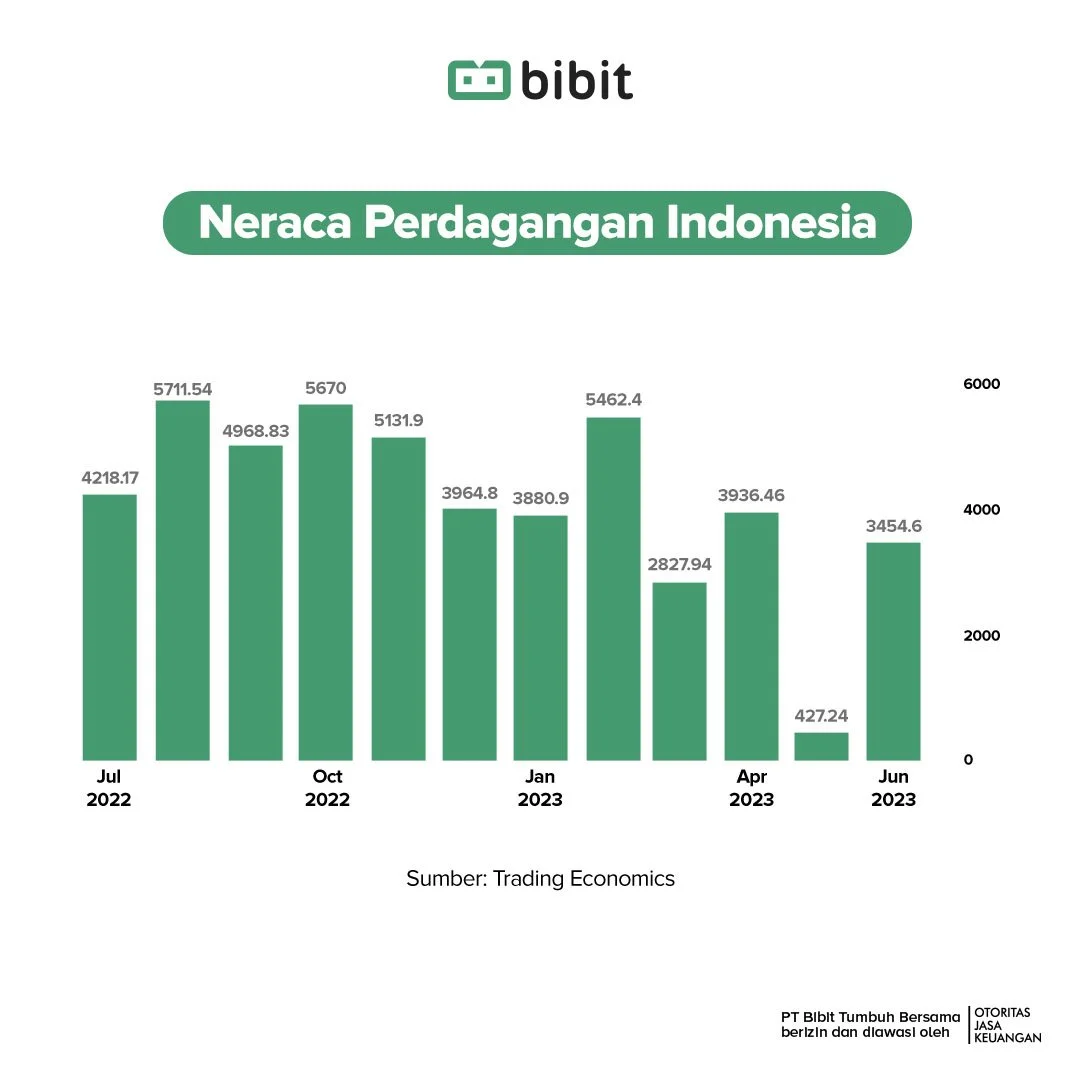 Indonesia mencatatkan surplus neraca perdagangan sebesar US$3,45 miliar pada Juni 2023, melampaui proyeksi konsensus di US$1,16 miliar dan menandai surplus ke-38 bulan secara berturut-turut.