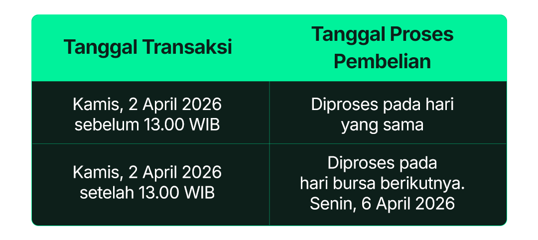 Transaksi pembelian dan penjualan Obligasi FR yang dilakukan pada Kamis, 2 April 2026 setelah pukul 14.00 WIB akan diproses di hari kerja berikutnya: Senin, 6 April 2026.