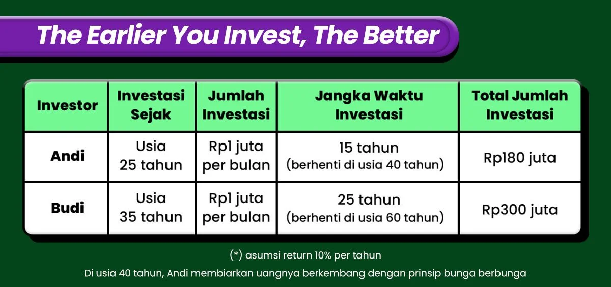 Memulai investasi rutin sejak dini memberikan keuntungan dengan adanya konsep ‘Bunga Berbunga’ atau ‘Compounding Interest’.