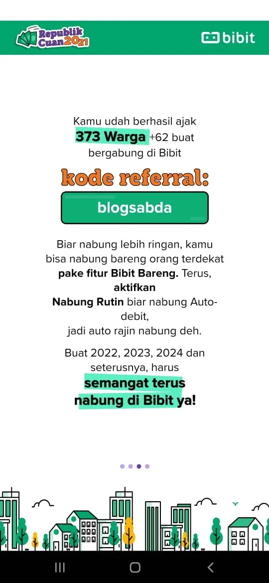 Sabda ini ter-detect sudah berhasil mengajak 373 warga Indonesia untuk bergabung di Bibit dan memulai reksadana. Bukan jumlah yang sedikit, lho. Itu berarti kamu punya tujuan baik agar seluruh warga Indonesia bisa memiliki pengelolaan keuangan yang baik.