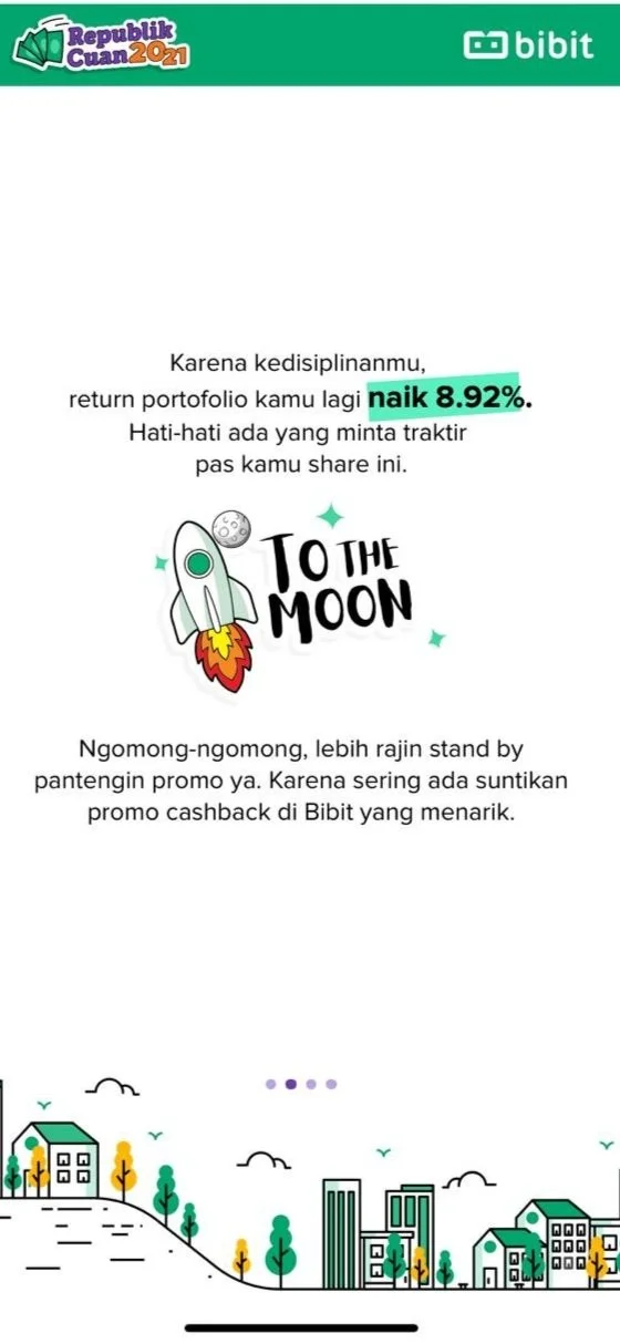 Kalau hasilnya memuaskan, selamat berarti kamu sangat hebat ngembangin cuanmu sampai bisa konsisten hingga detik ini. Tapi, kalau belum sesuai ekspektasi kamu, jangan bersedih. Tetap semangat, yuk, terus menabung di aplikasi Bibit. Perjalanan investasi reksa dana di 2021 mungkin sangat berat buat kamu, tapi setidak Bibit apresiasi kemauan kamu untuk tetap bertahan nabung di Bibit.
