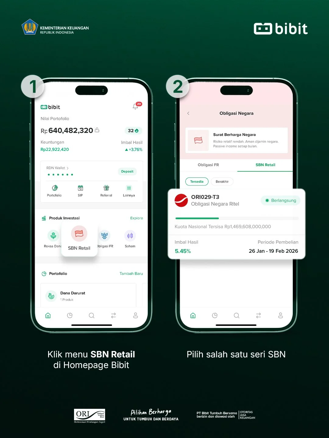 SBN jenis Sukuk Ritel seri ORI029 sudah bisa dibeli di Bibit dengan masa penawaran mulai 26 Januari 2026 pukul 09.00 WIB hingga 19 Februari 2026 pukul 10.00 WIB