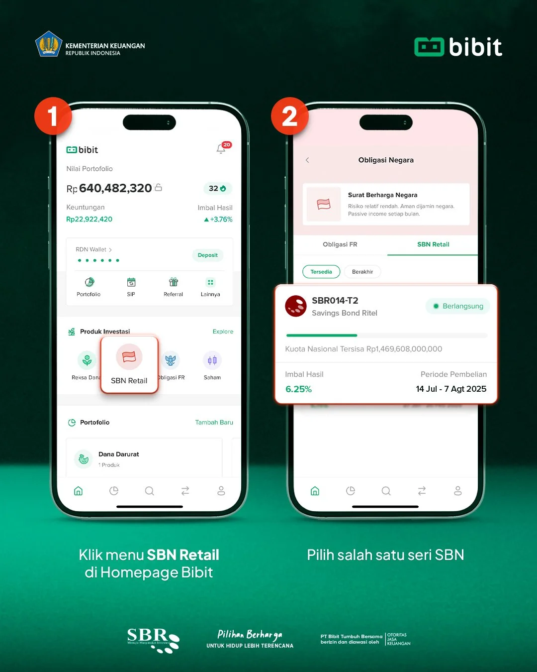 SBN jenis Savings Bond Ritel seri SBR014 sudah bisa dibeli di Bibit mulai mulai 14 Juli 2025 pukul 09.00 WIB sampai 7 Agustus 2025 pukul 10.00 WIB.
