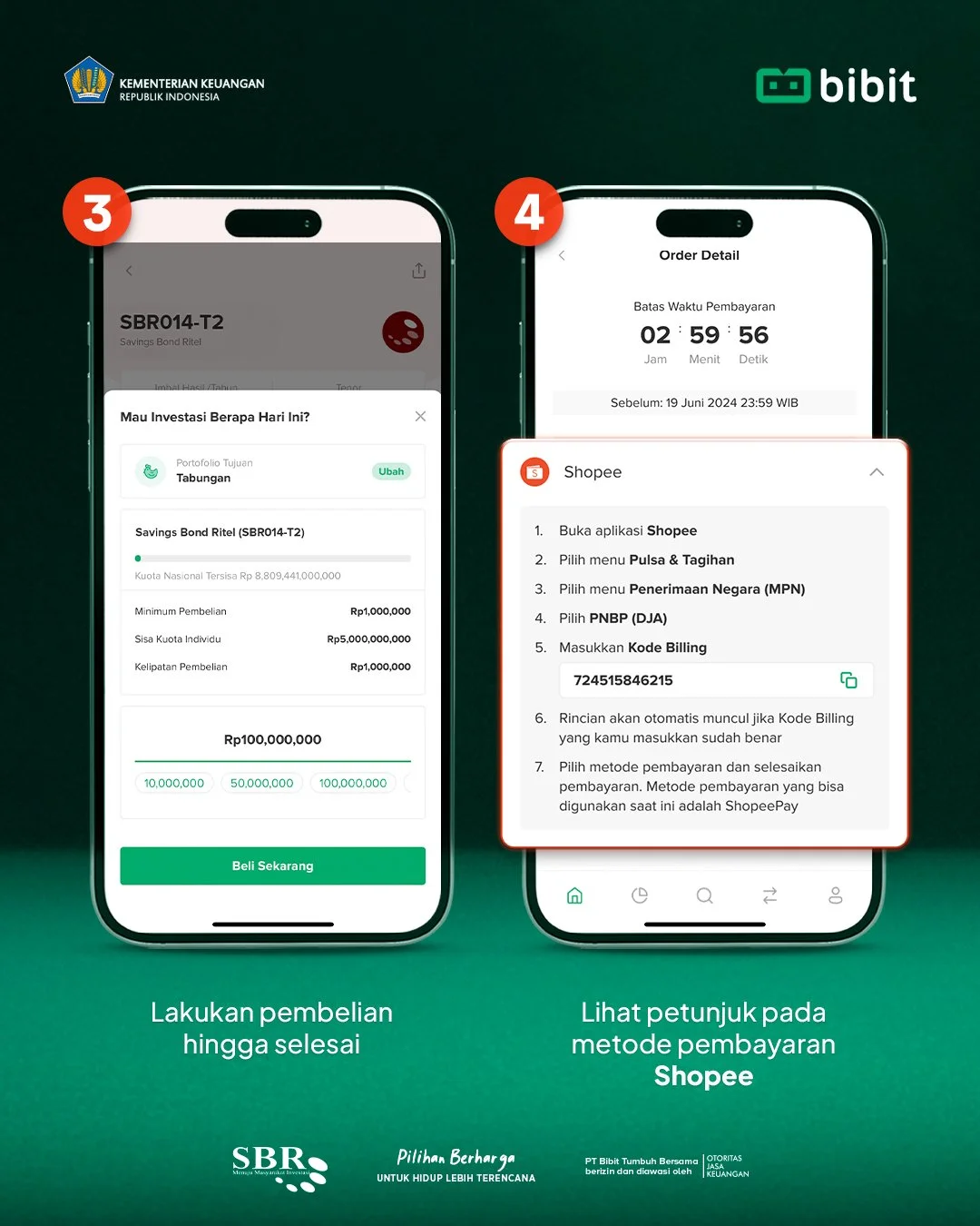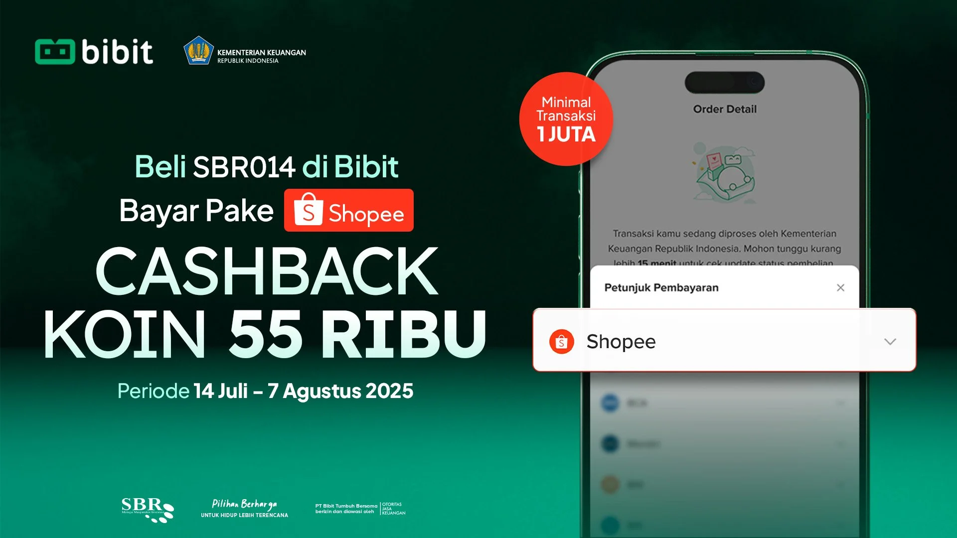 Promo berlaku untuk transaksi SBN seri SBR014 di Bibit senilai Rp1 juta hingga Rp50 juta yang menggunakan metode pembayaran Shopee selama 14 Juli - 7 Agustus 2025.