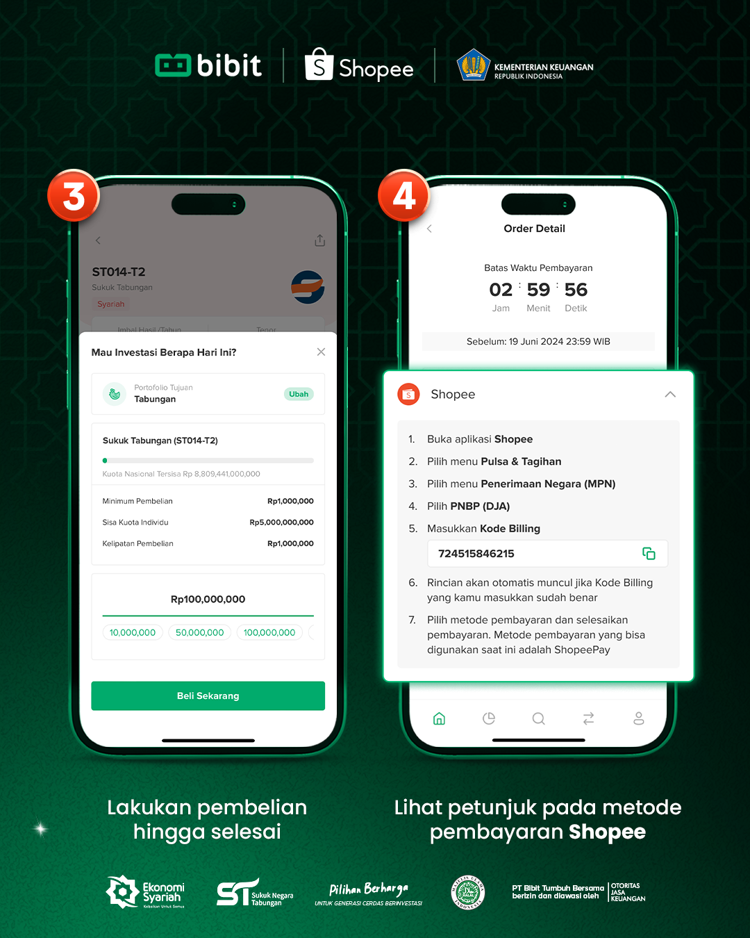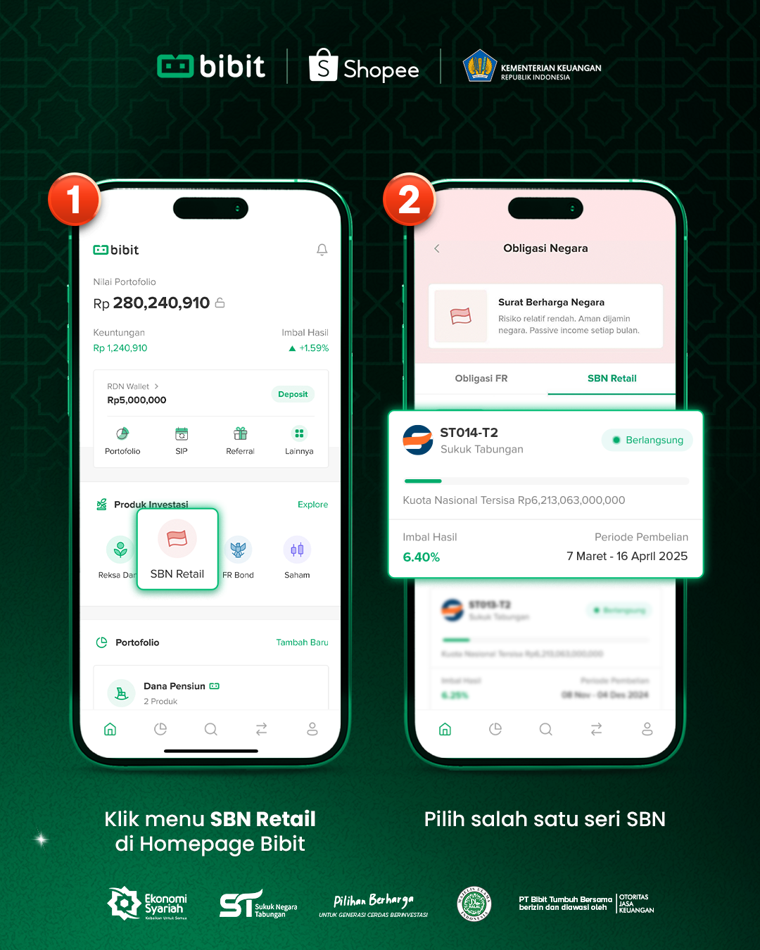 Promo berlaku untuk transaksi SBN ST014 di Bibit senilai Rp1 juta hingga Rp50 juta yang menggunakan metode pembayaran Shopee selama 7 Maret - 16 April 2025.