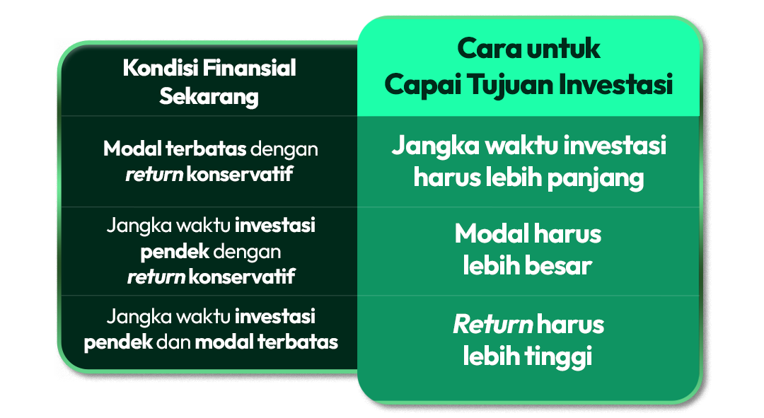 Berikut, cara untuk mencapai tujuan investasi jika hanya memiliki sebagian dari faktor tersebut: