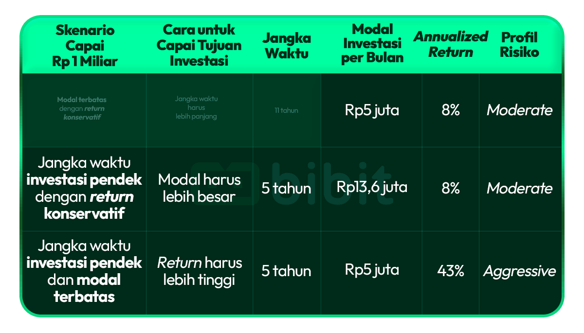 Dari tabel di atas, tujuan investasi Rp1 miliar bisa dicapai dengan waktu lebih cepat dan modal terbatas jika investasimu menghasilkan return lebih tinggi.
