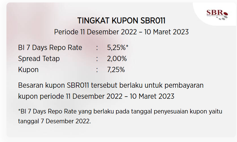 Berdasarkan web resmi DJPPR Kemenkeu, tren kenaikan imbal hasil juga terjadi pada SBR011. Saat awal diterbitkan, pemerintah menetapkan kupon minimal SBR011 hanya 5,5%. Kini, imbal hasil SBR011 naik menjadi 7,25% untuk periode 11 Desember 22-10 Maret 2023.