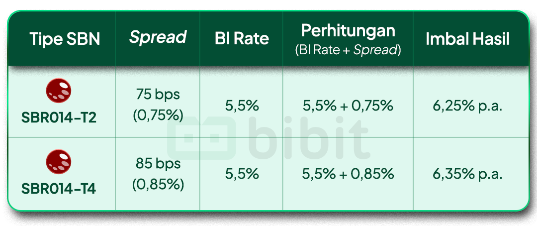 Misalnya: spread tetap SBR014 yang ditentukan DJPPR Kementerian Keuangan adalah 75 bps (0,75%) untuk SBR014-T2 dan 85 bps (0,85%) untuk SBR014-T4.